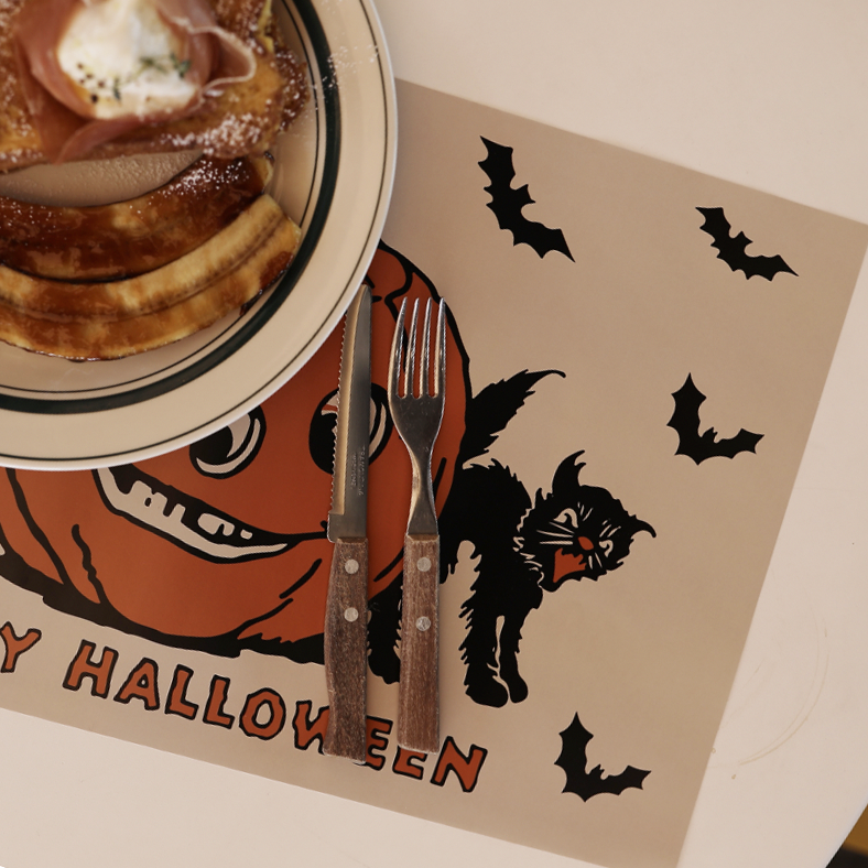 식당이나 레스토랑 가면 한장 툭 깔려 있자나요. 플레이스 매트를 테이블링에 사용하는 기본적인 목적은 식사후 청소를 쉽게 하는데 주목하지만 , 우리는 작은것에도 마법을 부려야 하니까 :-) 사소함도 그냥 지나칠수 없으니까 ! 검은 고양이와 박쥐로 둘러싸인 중앙의 키치한 잭오랜턴이 특징인 복고풍 할로윈 디자인으로 빈티지한 무드를 가득 담아 봤어요. 유니크한 디자인 덕분에 어느 플레이스에서든 빛을 낼꺼라고는 예상도 못했다죠 ?! 테이블 스타일링에도, 현관에도, 아이방에도, 상업용 공간의 장식용으로, 포스터가 필요했던 공간에 한장 두장 세장 매니매니 붙여도 느낌 있으니까 ! 넉넉히 다양하게 활용하시라고 넉넉한 수량에 해피 프라이스까지 ! 빈티지한 갬성 한가득 담아 미다비다 메이드로 자신있게 추천드려요 .
