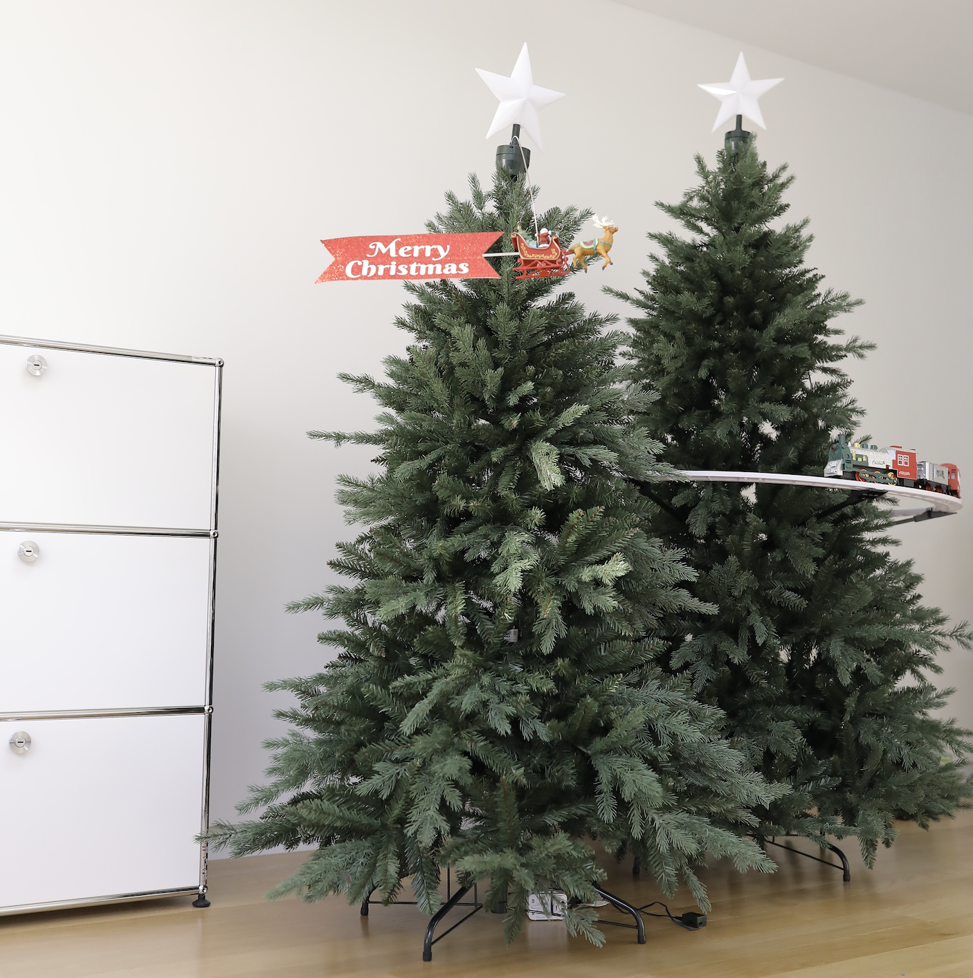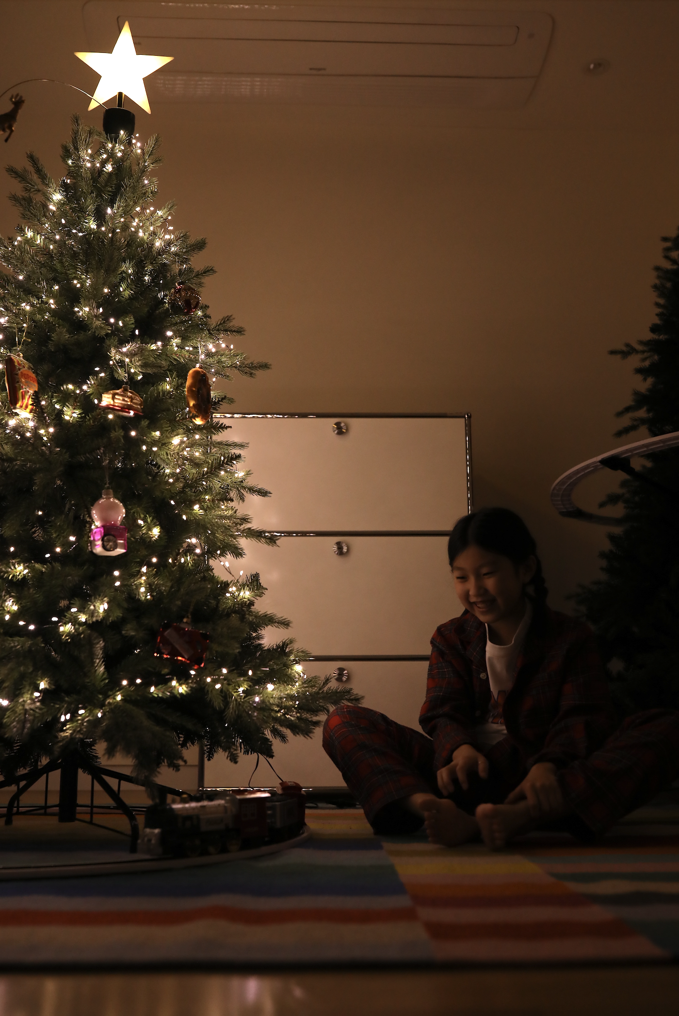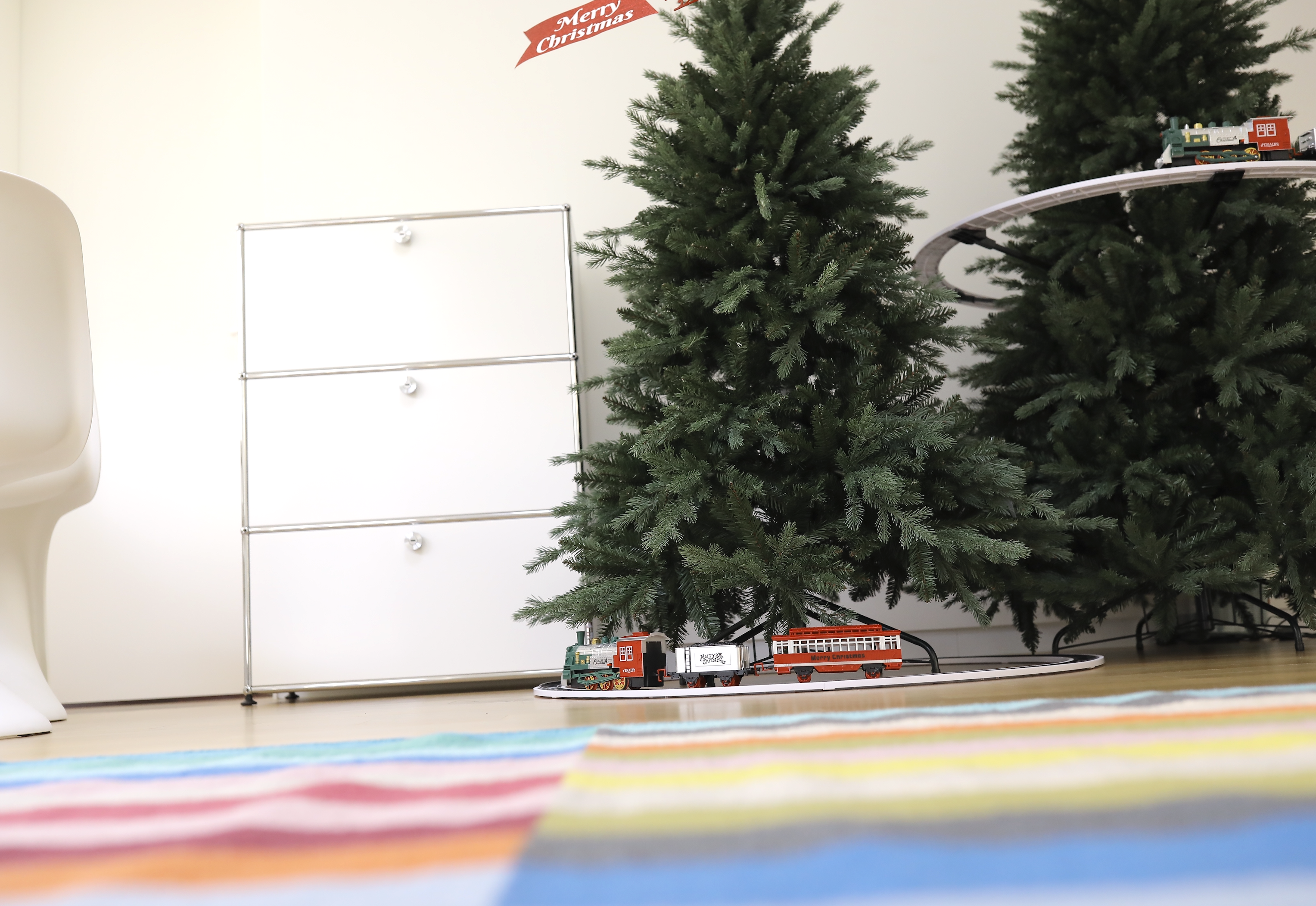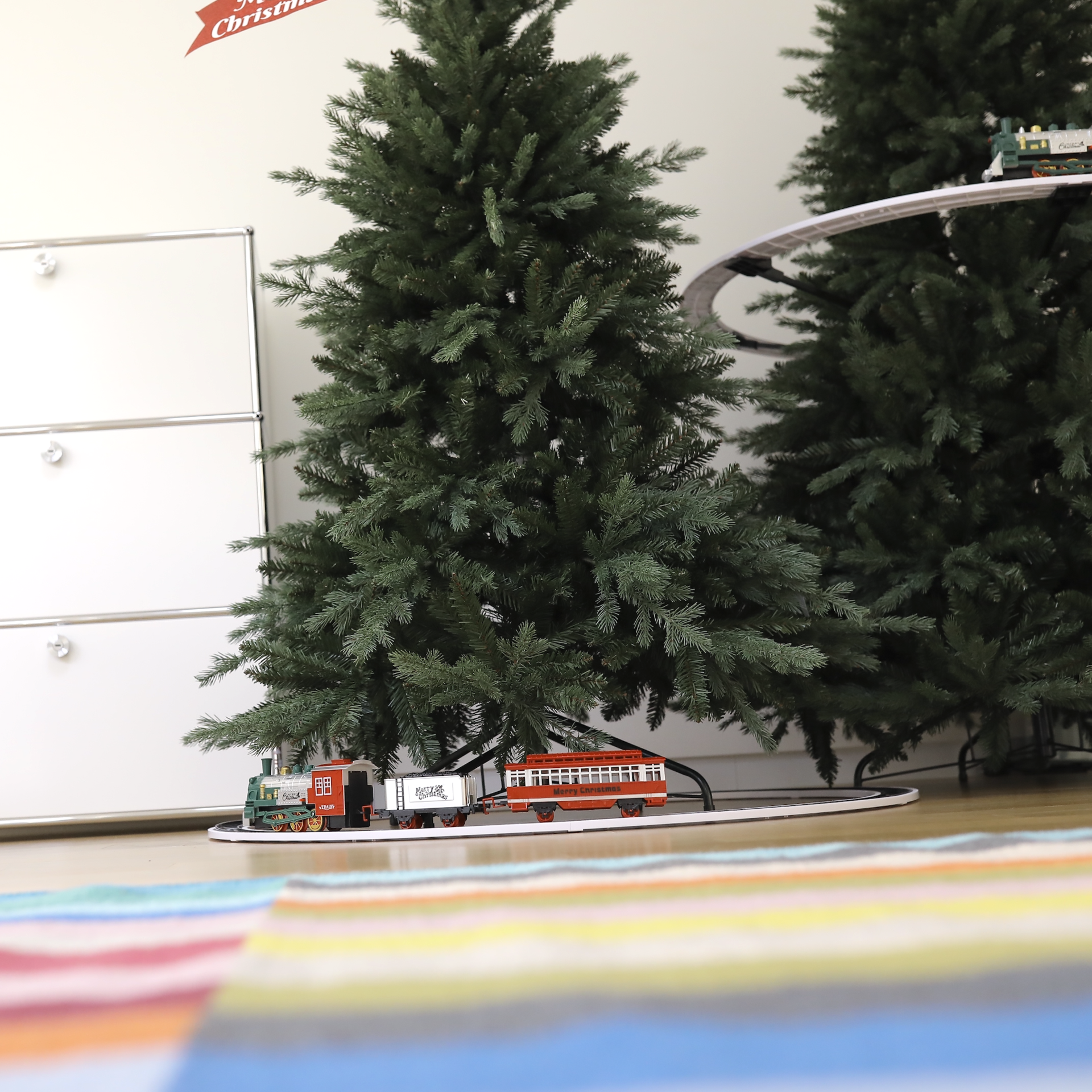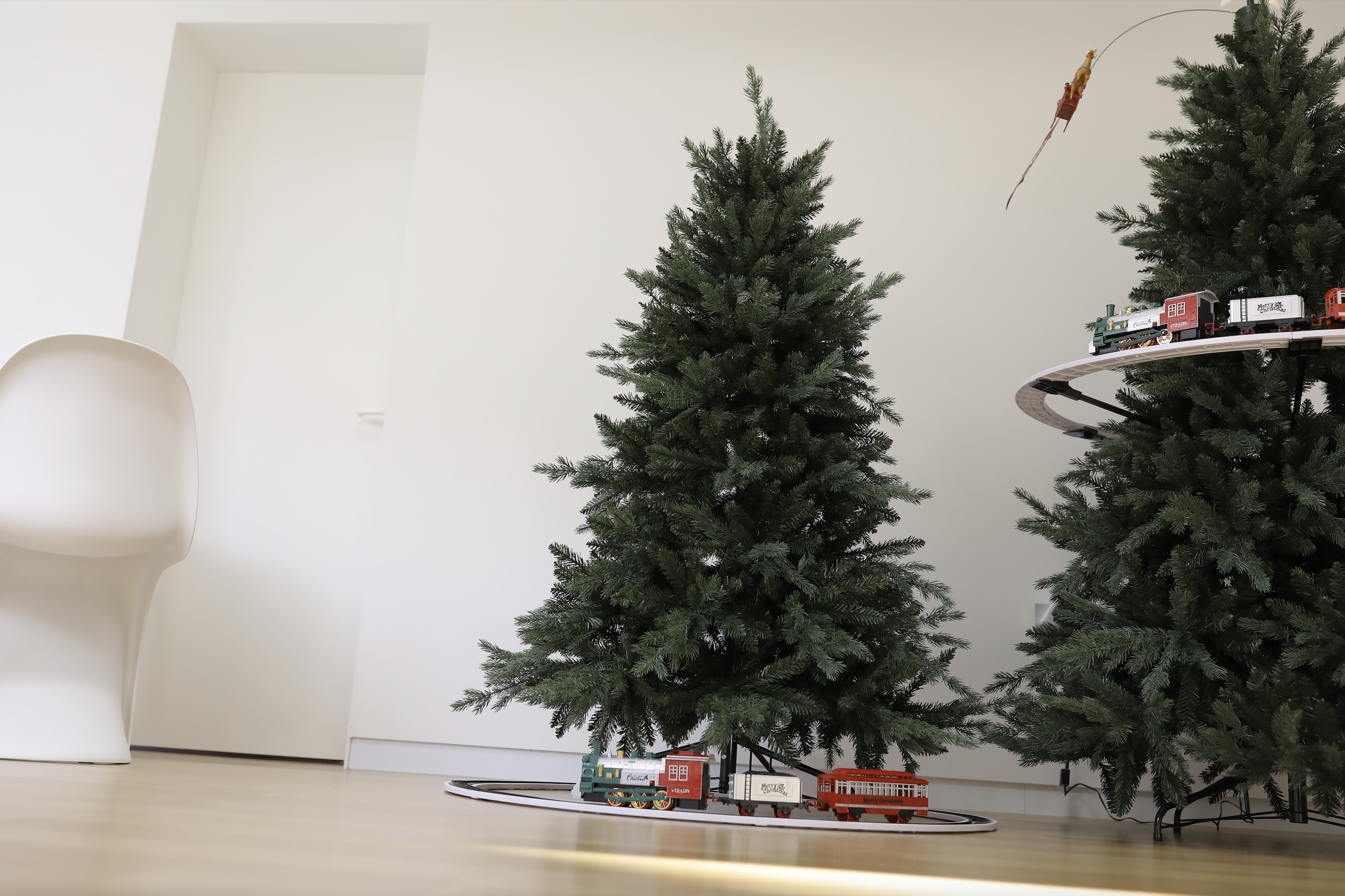 아래에 트리 기차를 둘수 있는 가능성에 제일 아래 트리단이 과하면 안되었어요 . 애 키우는 마음에 먼지는 늘 경계 대상 !!! 아래단이 무거운 스커트 트리는 일단 탈락 .