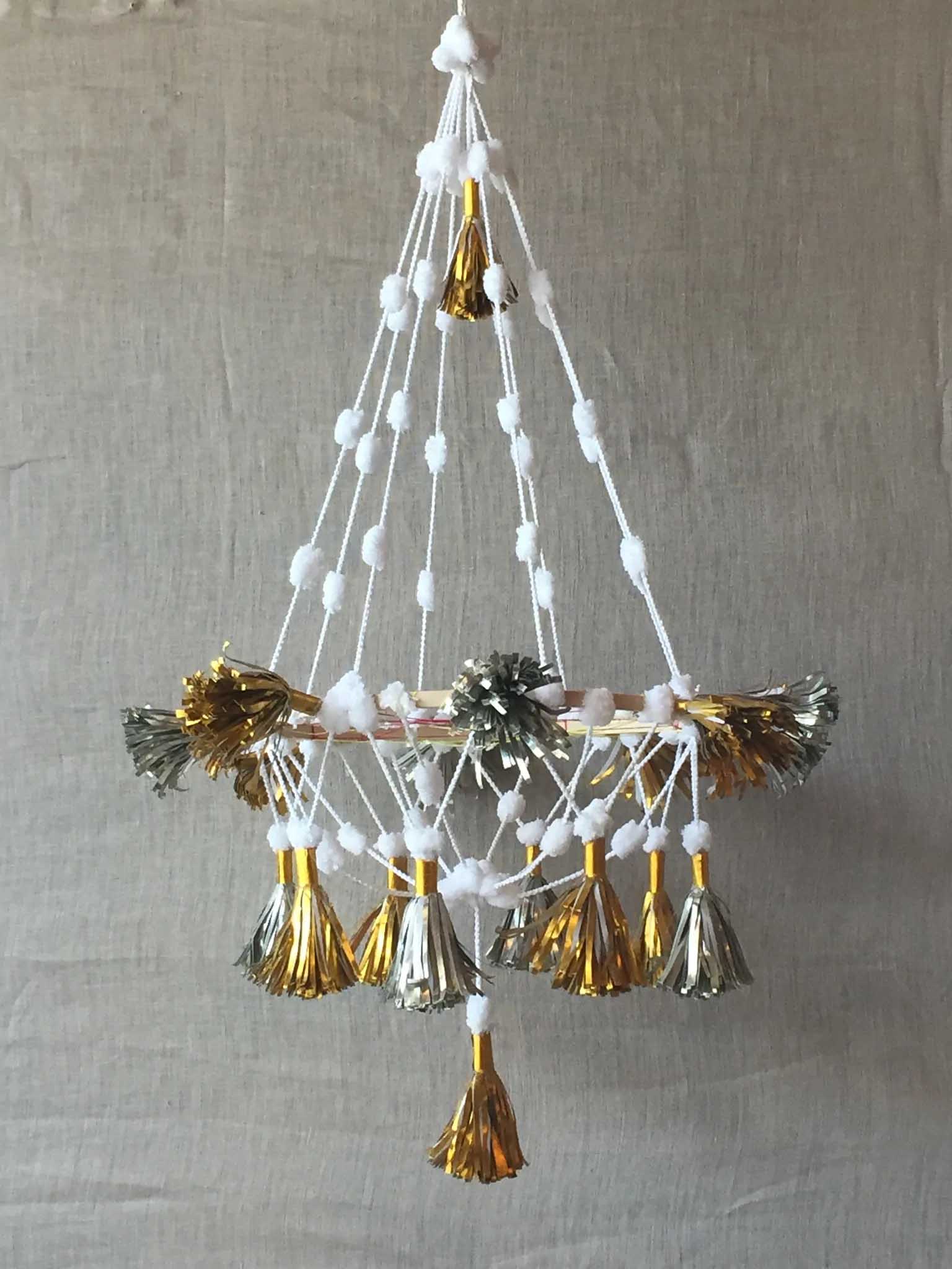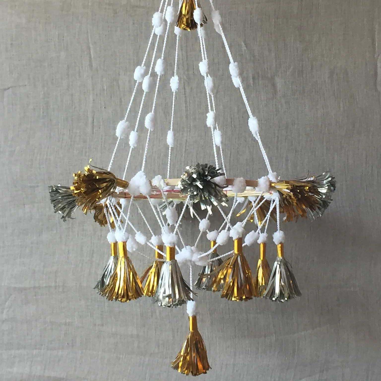 Beautiful, sturdy handmade paper chandelier with alternating colored tassels surrounding a 12" wooden hoop. Hung from bright, festive pom poms (approximately 18" in length)