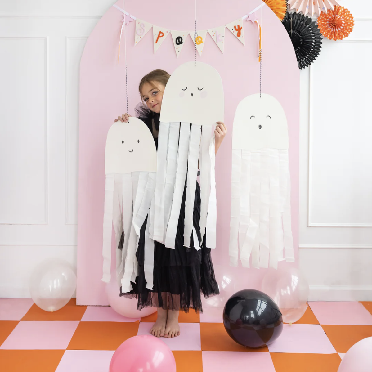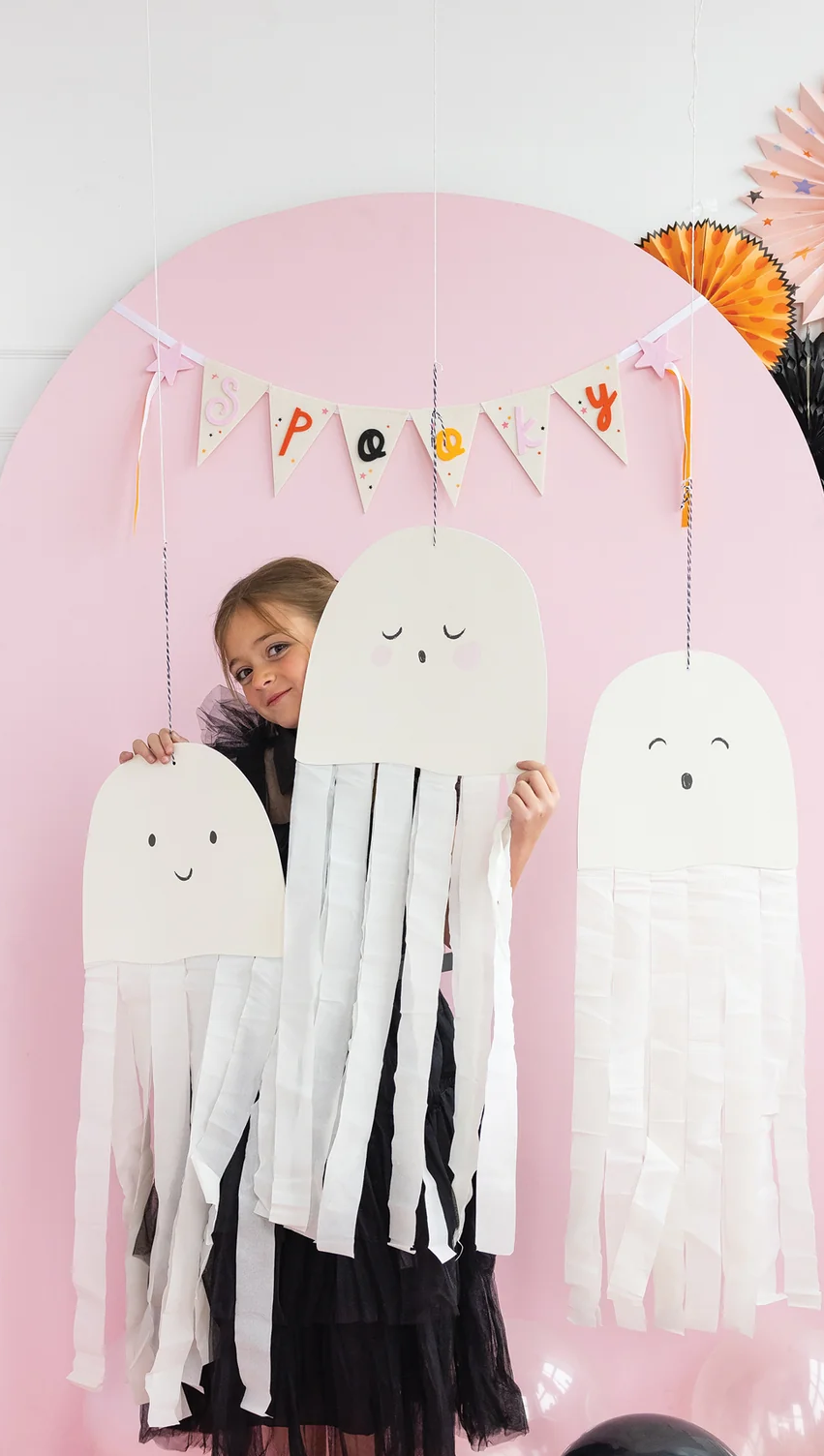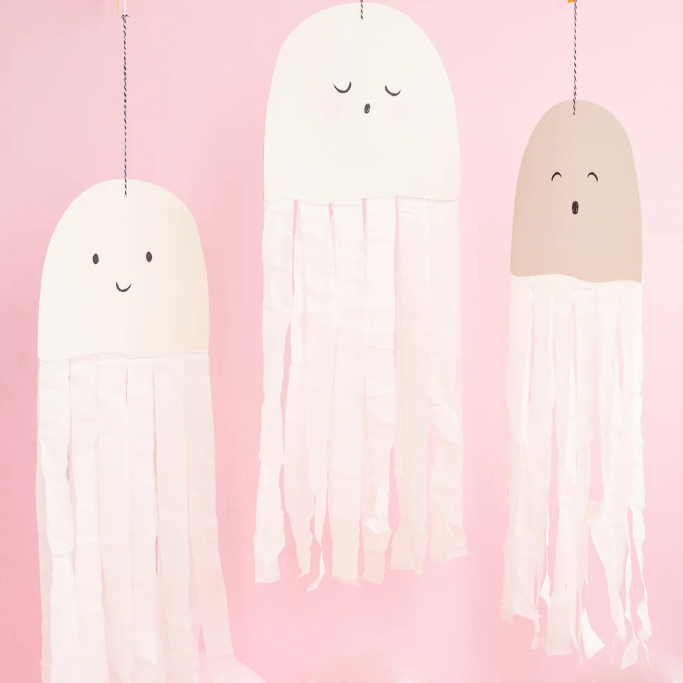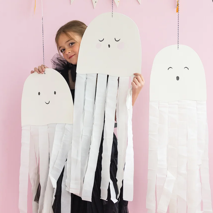 세가지 표정의 고스트 3종류 , 각 2장 , 총 6개의 크레이프 고스트가 들어 있습니다 , 고스트의 몸통에 원하는 길이의 스트리머를 붙여주면 살랑살랑 크레이프 고스트가 뚝딱 완성 됩니다 . 넉넉한 길이의 스트리머가 들어 있어 고스트의 총길이를 90cm까지 연출하실 수 있습니다 .