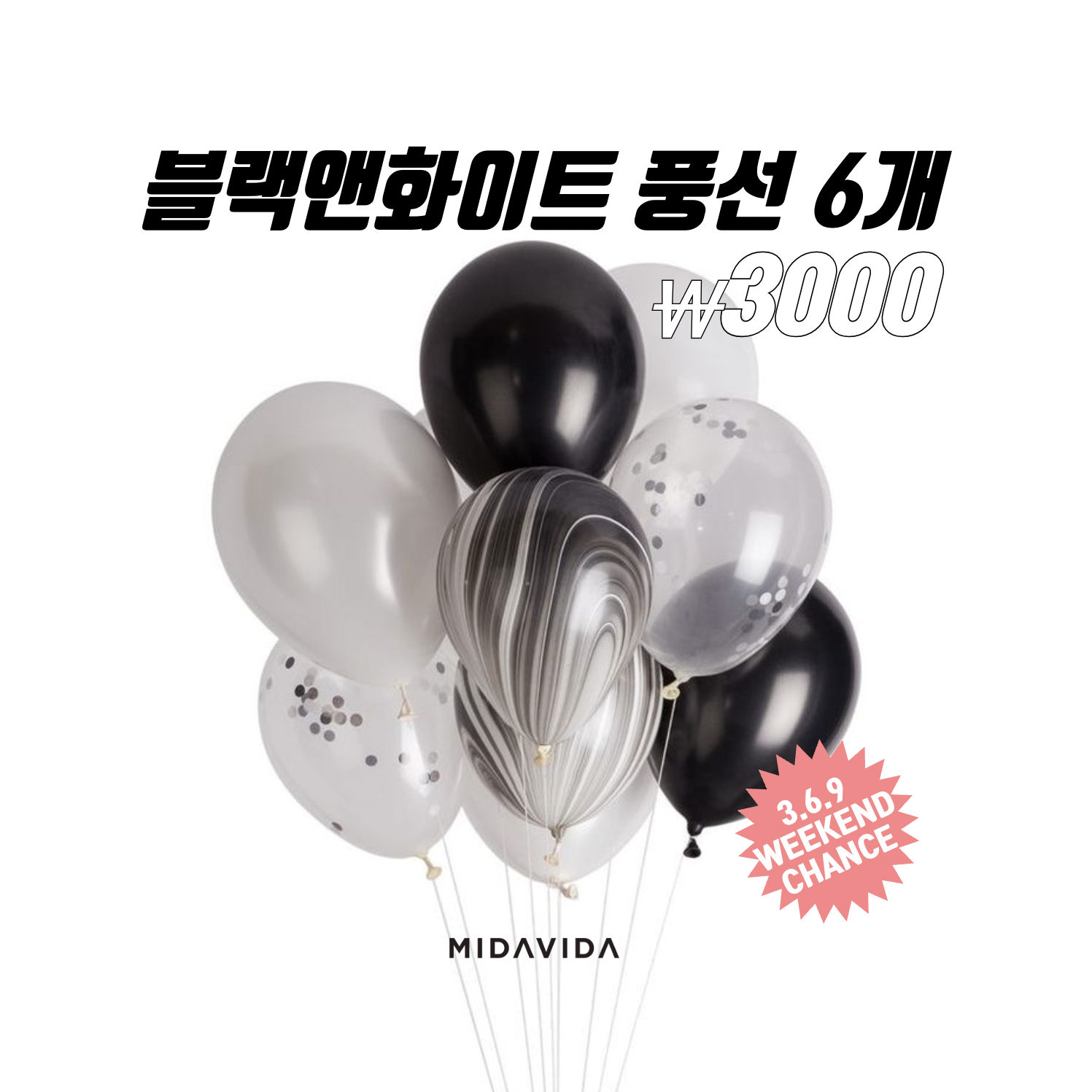 ( 리퍼브 - 70% ) 블랙앤화이트 랜덤풍선 [ 6pcs +컬링리본 ]